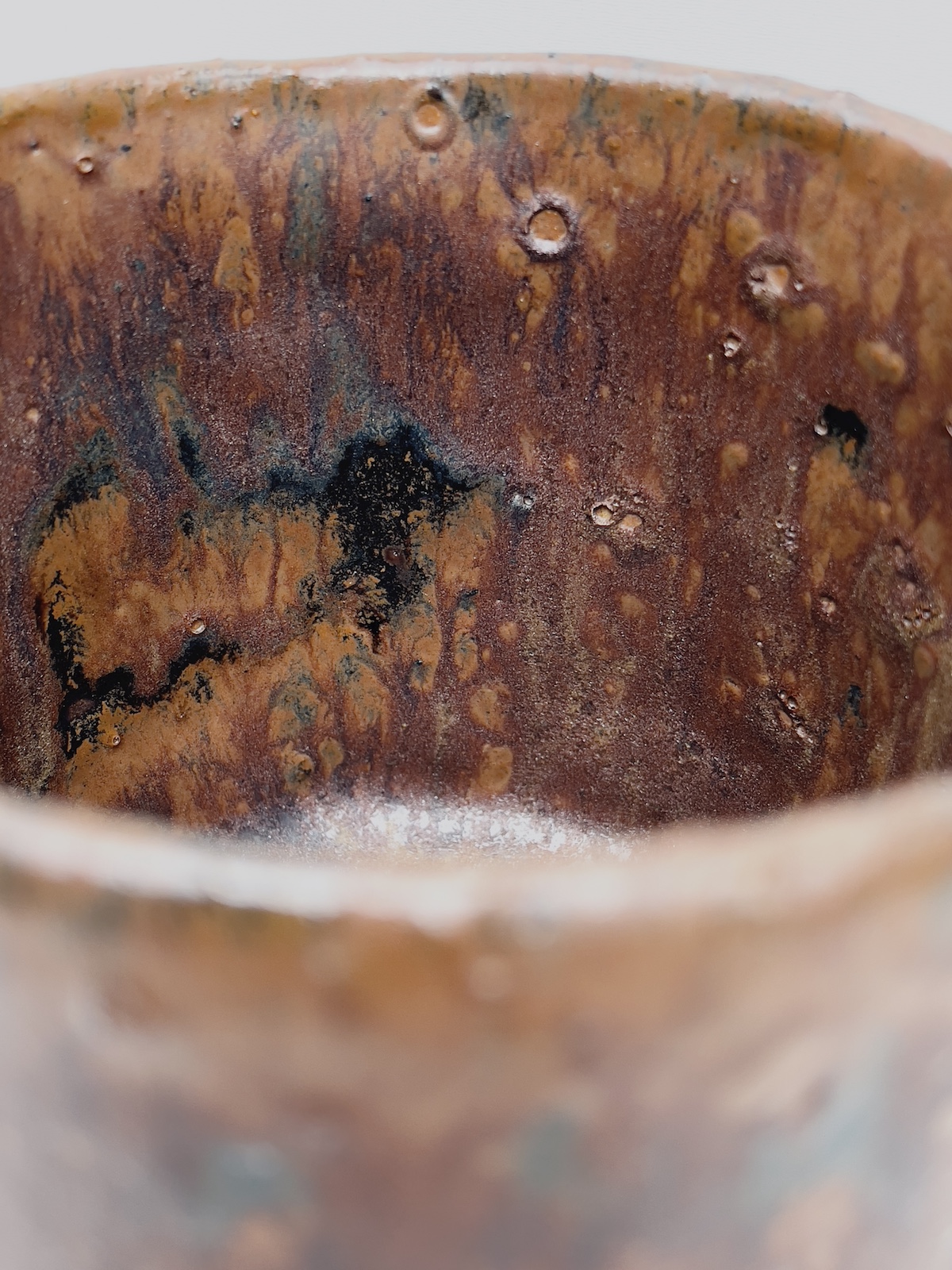 A SIMPLE MATCHA BOWL WITH A RUST LIKE, TEXTURED GLAZE AND CRATERS.