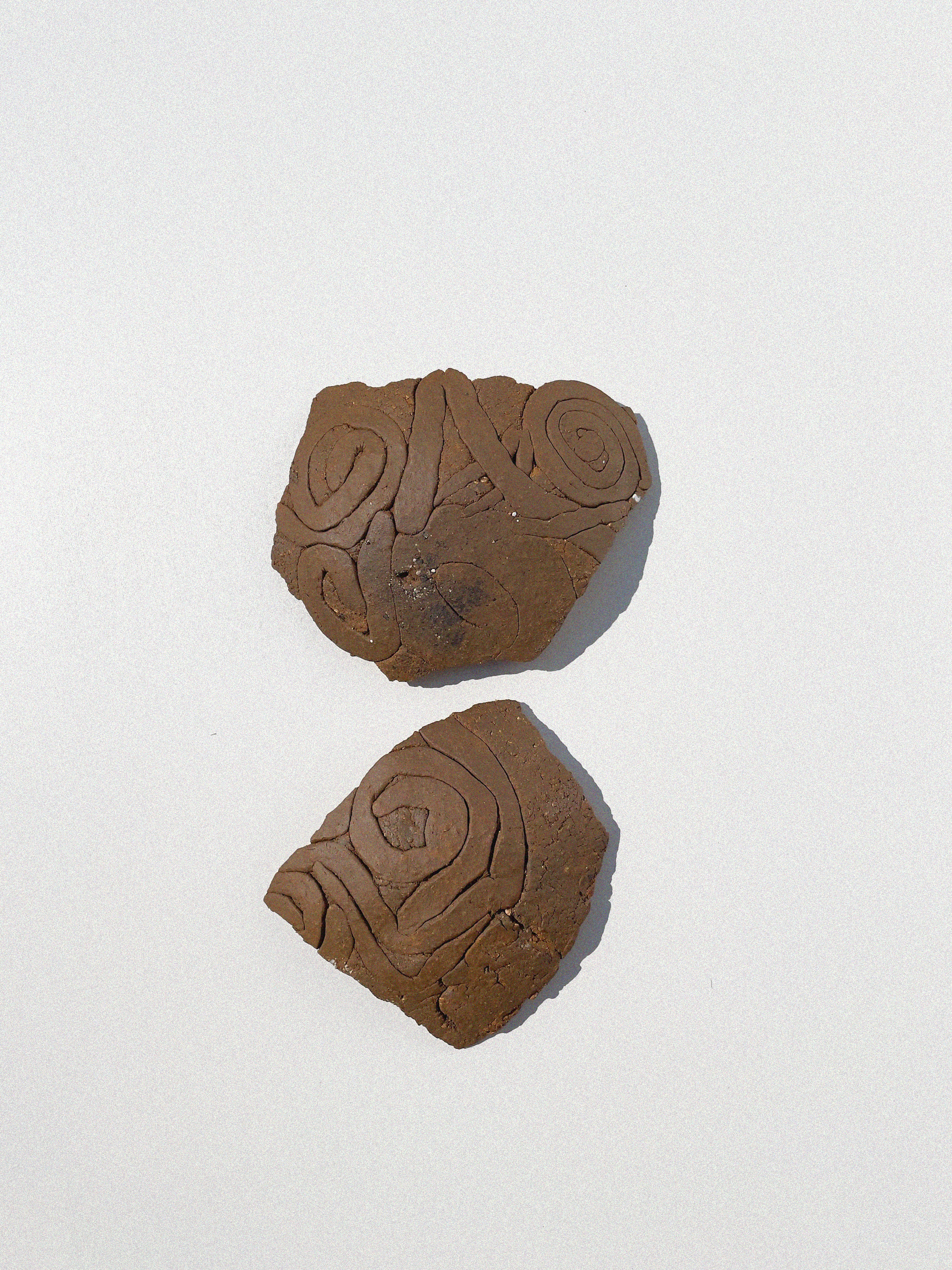 Origin, 2021 was the Lisa Geue’s first contact with traditional shapes of vessels and the ancient coiling technique that has been used to create functional vessels since 14,000 BC. Pottery from the Jōmon period in Japan (c. 14,500 - c. 300 BCE) were sources of reference for form and building technique. The title refers to the Jōmon period as the earliest major culture of prehis-toric Japan, characterized by pottery decorated with cord-pattern (jōmon) impressions or reliefs, but also to the artist’s first coiled- built vessels, her first body of work in general. Having a wide body, smaller neck and again a wider mouth, Origin explores recurring anthropological shapes of vessels and modern aesthetics of an artifactual character. The remnants of a smashed bowl appear as if they are artifacts of this Neolithic culture. They are to be seen as a direct reference to the Jōmon period and its influence on this work. By creating and using a traditional Shino glaze, Geue emphasizes the reference to traditional Japanese pottery. In applying multiple layers of glazes, different textures evolve, both building up or leaving craters, cracks and holes. Shino glazes crawl, bubble and build up and so these glazing processes resulted in highly textured surfaces that can be associated with sea froth, coral reefs and coastal sediments and their weather-related degradation.